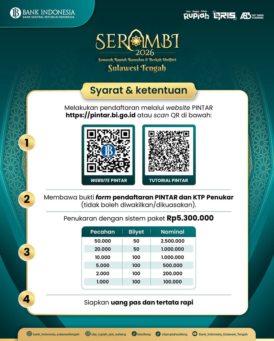 Selain menyiapkan uang tunai, BI Sulteng juga kembali menggelar program Semarak Rupiah Ramadan dan Berkah Idul Fitri (SERAMBI) 2026 yang dimulai sejak 18 Februari 2026 dengan tema “Rupiah Memberi Makna di Bulan Penuh Berkah.”