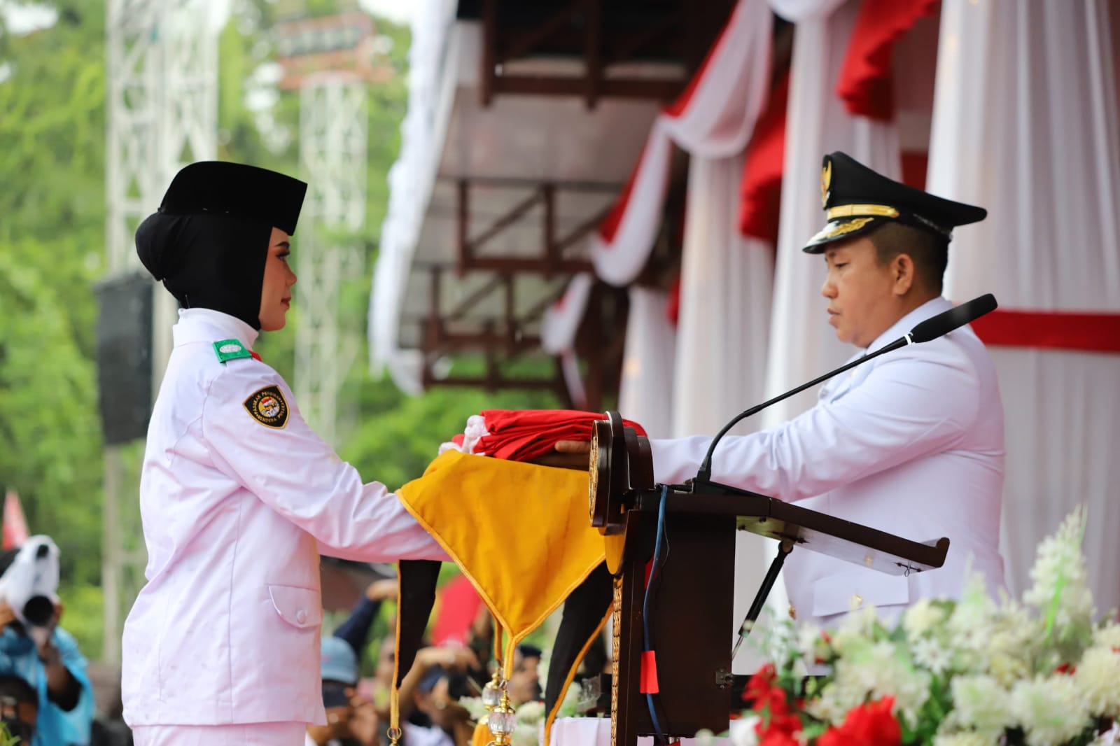 Momen tersebut disambut dengan penghormatan dan nyanyian lagu Indonesia Raya oleh seluruh peserta upacara.
