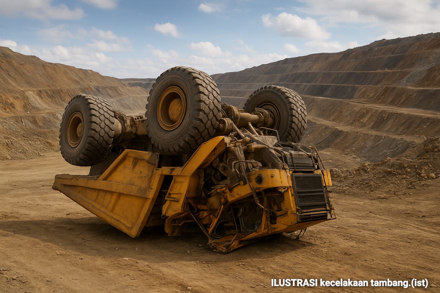 Informasi yang dihimpun media ini menyebutkan, sebuah truk pengangkut material tambang terguling dan terperosok ke lubang galian saat hendak menanjak membawa material hasil tambang.