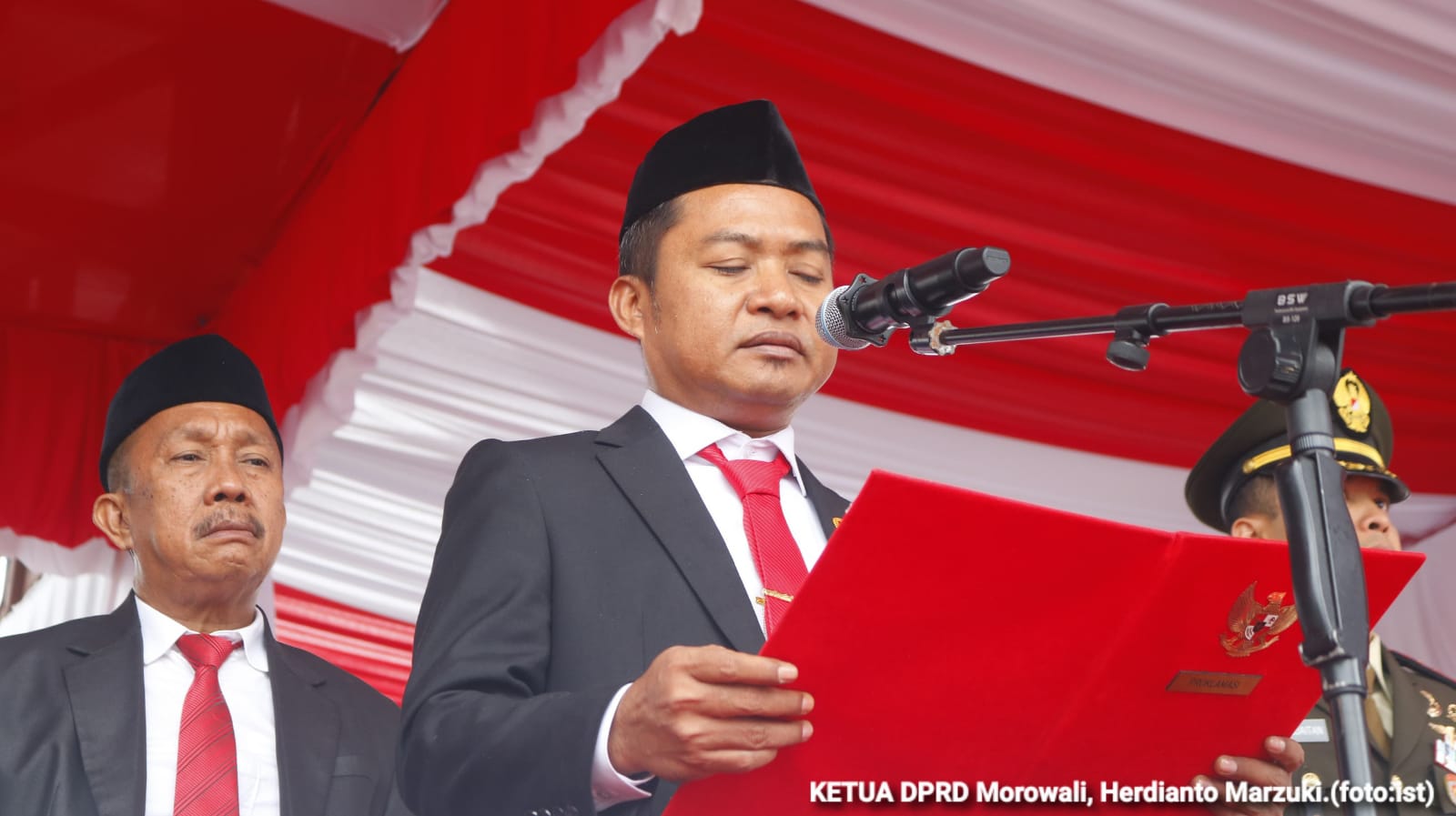 MOROWALI,Brita.id– Ketua DPRD Kabupaten Morowali, Herdianto Marsuki, SE, mendapat kehormatan membacakan teks Proklamasi pada upacara peringatan Hari Ulang Tahun (HUT) ke-80 Kemerdekaan Republik Indonesia di Kabupaten Morowali, Minggu (17/8/2025).