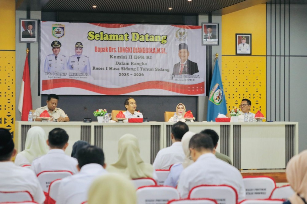 MOROWALI,Brita.id – Pemerintah Kabupaten Morowali menyambut hangat kunjungan kerja Anggota Komisi II DPR RI, Drs. H. Longki Djanggola, M.Si, dalam rangka Reses Masa Sidang I Tahun 2025–2026, yang digelar di Aula Kantor Bupati Morowali, Rabu (8/10/2025).