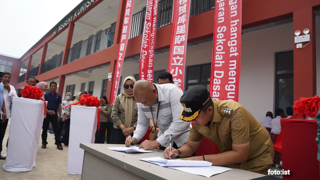 Fasilitas yang diserahkan meliputi 12 ruang kelas baru, kantor kepala sekolah, perpustakaan, ruang UKS, fasilitas kamar mandi, serta tambahan 180 unit meja dan 12 papan tulis.