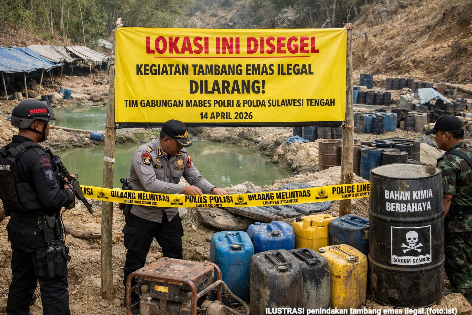 PALU, Brita.id– Tim gabungan Mabes Polri dan Polda Sulawesi Tengah (Sulteng) menyegel dua lokasi tambang emas ilegal di wilayah Ranodea, Kelurahan Poboya, dan Vatutela, Kelurahan Tondo, Kota Palu, Selasa (14/4/2026).