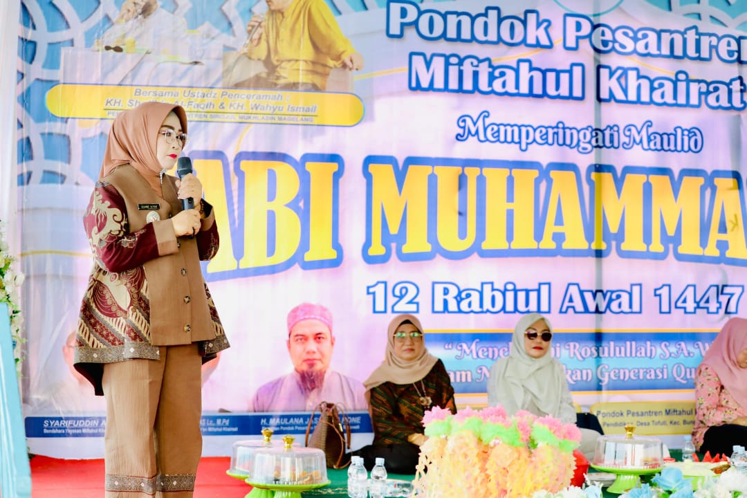 MOROWALI, Brita.id – Wakil Bupati Morowali, Iriane Iliyas, menghadiri peringatan Maulid Nabi Muhammad SAW sekaligus wisuda tahfidz Al-Qur’an di Pondok Pesantren Miftahul Khairat, Kecamatan Bungku Tengah, pada Kamis (25/9/2025).